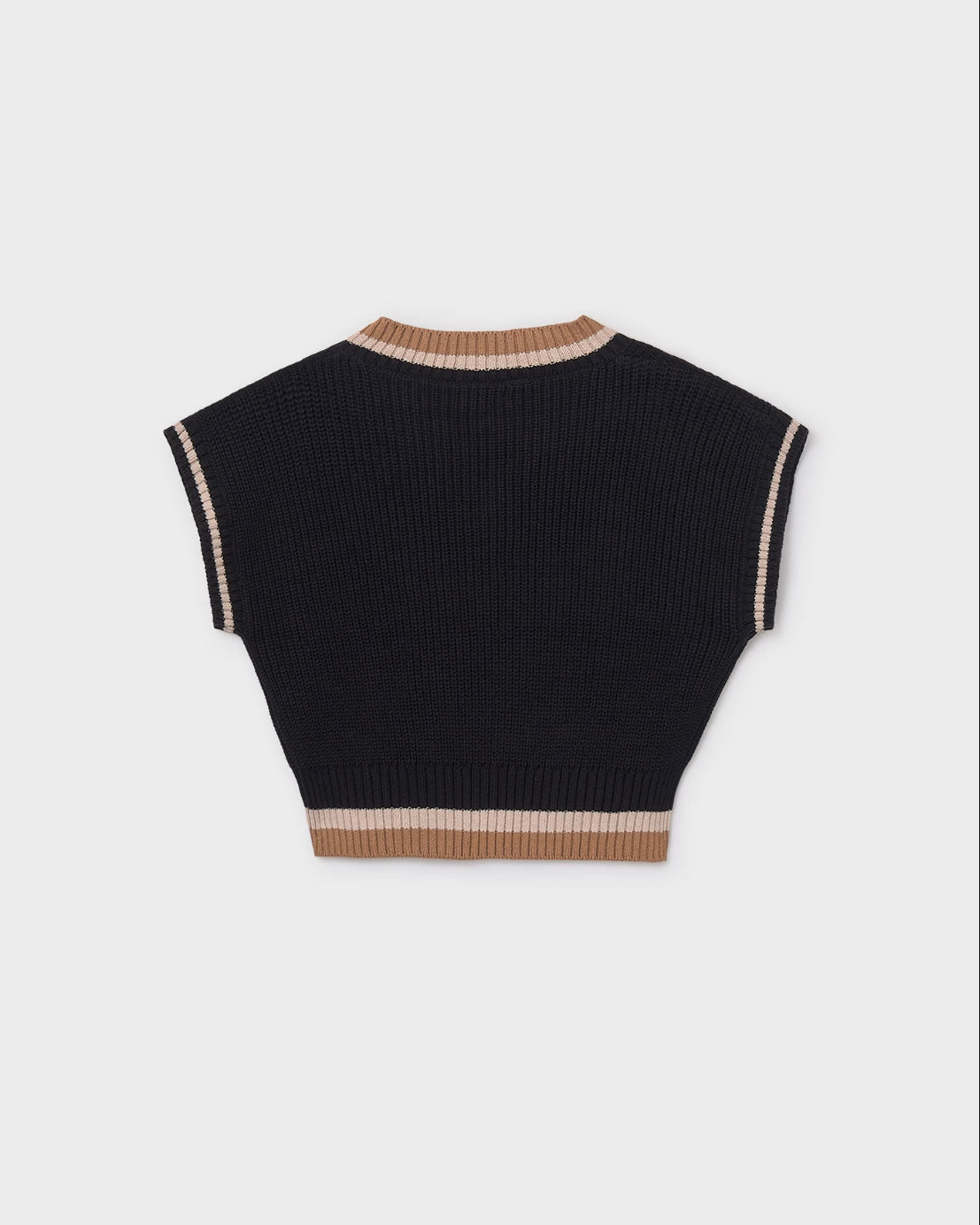 Chaleco para chica. Modelo con cuello de pico. Tejido de punto tricotosa de tacto suave y agradable. Elementos de adorno: detalles de color a contraste.