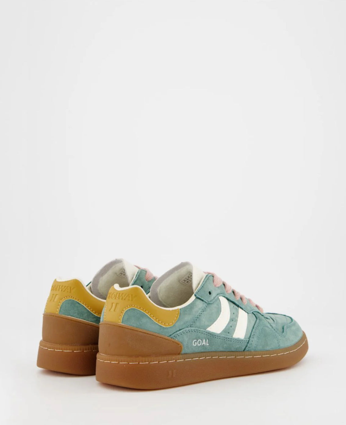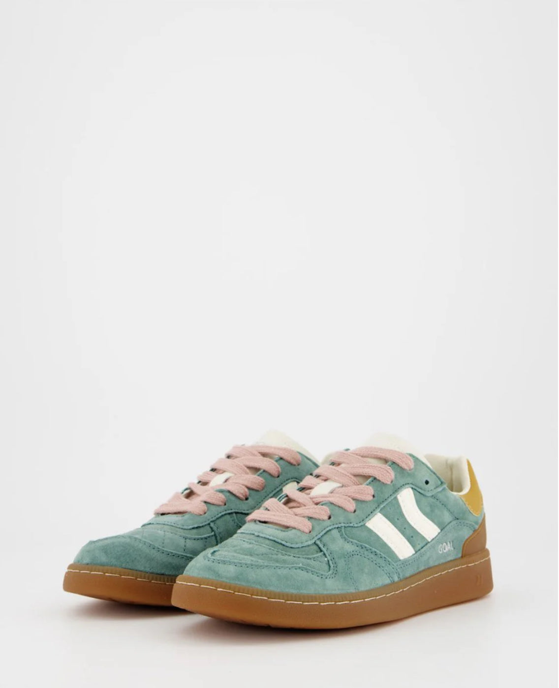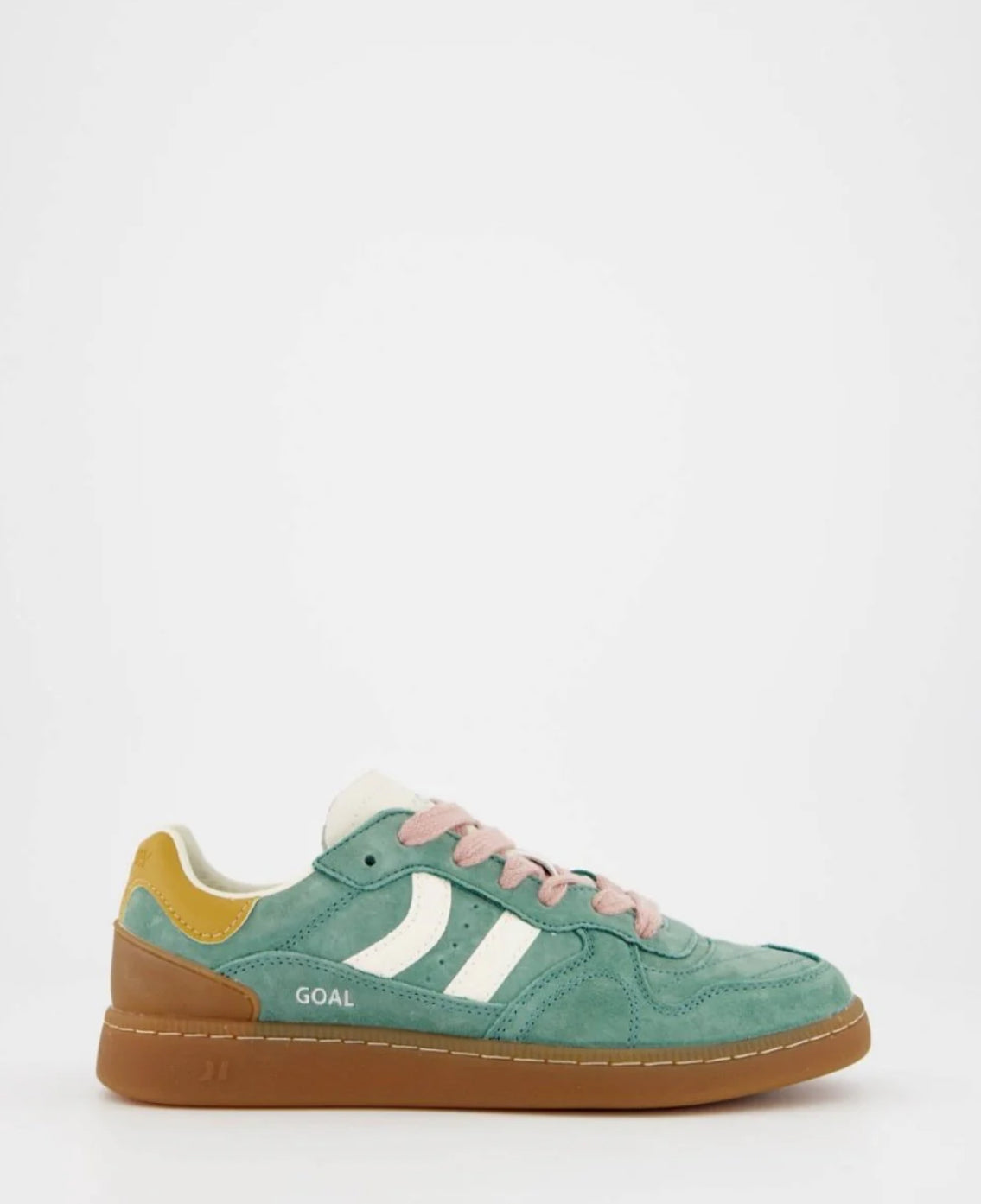 Zapatilla deportiva de serraje con detalles en contraste de color. Lengüeta de piel y preformada con un acolchado figurado. Vistas del forro en piel. Cordones planos de algodón en dos tonos intercambiables. Cuello ligeramente acolchado. La parte delantera lleva un refuerzo de pespuntes. Suela flexible de goma/caucho que aporta durabilidad y agarre. Cuenta con el nombre del modelo “GOAL” en lateral en oro viejo.